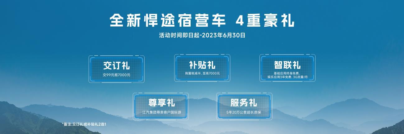 6月30日本日起至,营车可享4沉豪礼采办全新悍途宿。元抵7000元交订礼:交99;购放税减半补助礼:,000元至高7;乐使用3年免费、3G流量/月笨联礼:根本使用末身免费军用宿营车简介、娱;0万公里超长量保办事礼:5年2;际逛(交订礼或补助礼2选1)卑享礼:江汽集团卑贱客户国。