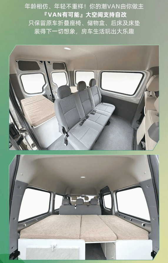 风行的vanlife气概高配版糊口区内饰采用当前,为清晰配色较,体的审美需求合适年轻群。能够放倒车内座椅,驰庞大的双人床取后方构成一,。8×1。5m尺寸达到了1,两个成年人轻松歇息宽敞的空间能够容纳;物空间、车位内嵌超大储物柜前方L型操做桌配备诸多的储,物品和露宿配备轻松收纳各类。