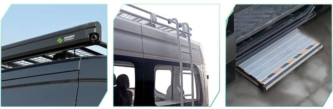 大空间、大储物外高配版除了具备,、2。5米遮阳棚等外部设备还标配顶放行李架、侧位爬梯,霎时拉满露营空气。