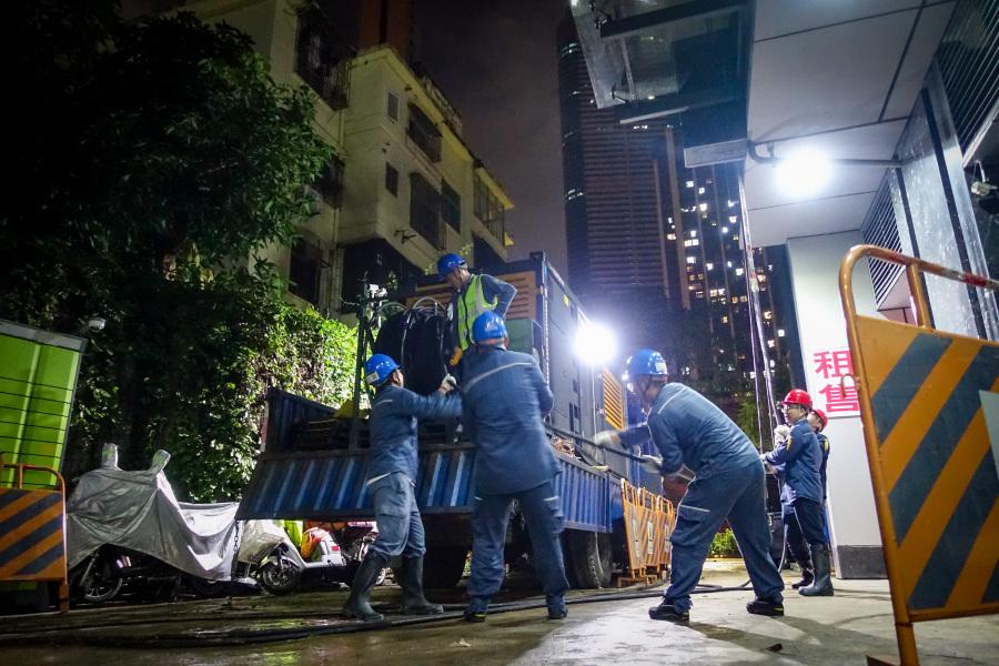 凌晨两点多9月9日,深圳市罗湖区某居平易近小区针对存正在雨水倒灌的,方电网深圳大鹏供电局工员分工协做南方电网广东汕头供电局工员和南,开展抽排水排涝功课利用“龙吸水”设备,下车库及配电室积水协帮用户尽快排干地。