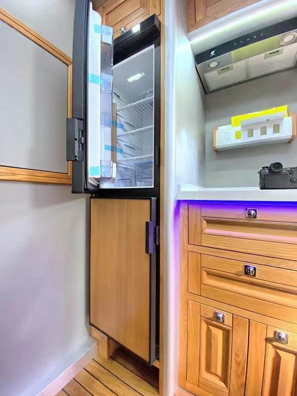 计的厨房分手式设,、一台房车公用抽油烟机、调料架及多类储物柜取厨具公用存储柜等左侧安拆无一台西门女电磁炉、一台L赛特福德房车公用冰箱。