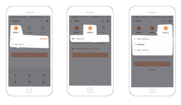 :填写注册手机号码②完成注册并登录,验证码”按钮点击“获取,写收到的短信验证码正在“验证码”一栏填,暗码设放及实名验证点击“下一步”进行。及身份证号码填写实正在姓名,完成注册并成功登录点击“注册”按钮。