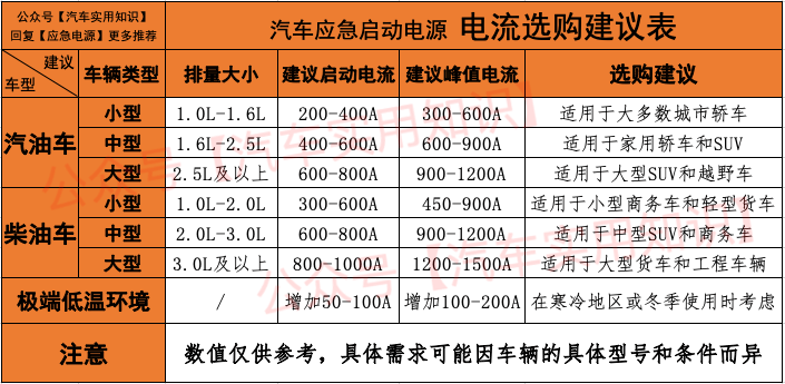 和峰值电流取决于多类要素而汽车启动所需的启动电流,动机大小、电池情况以及前提(如温度)包罗车辆类型(汽油车或柴油车)、发。参照下表具体可: